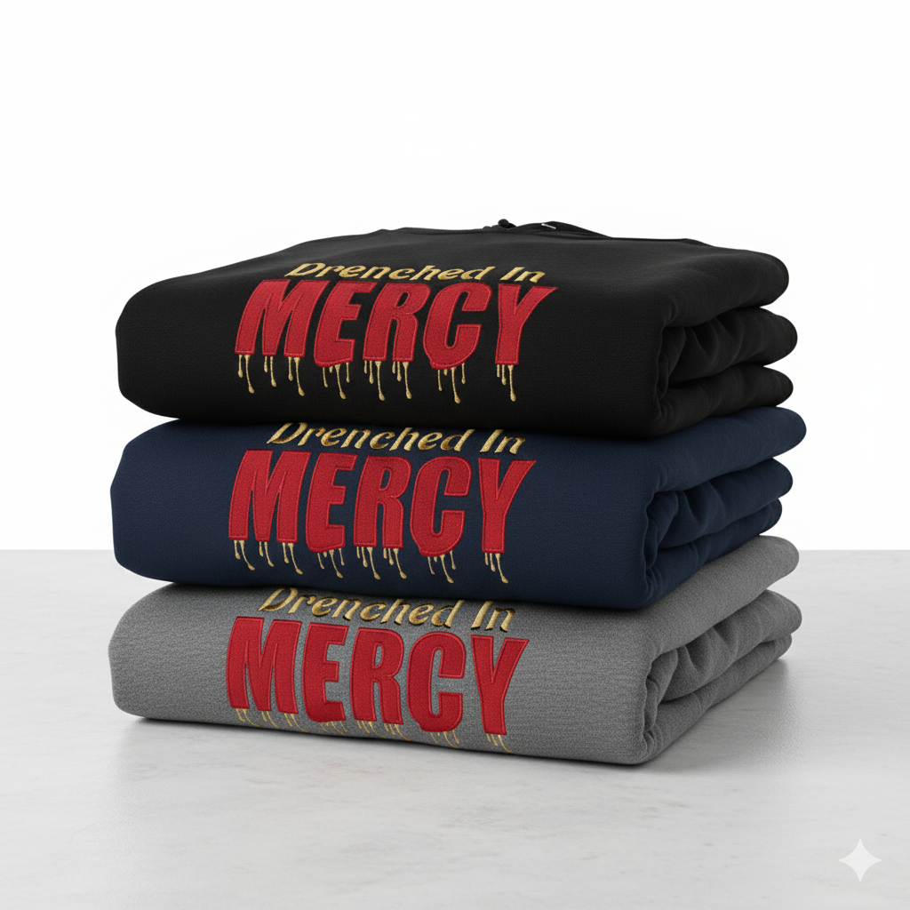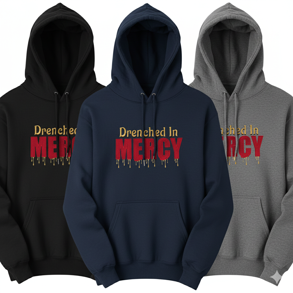 Make a statement with the “Drenched In Mercy” hoodie. Featuring a high-density, custom embroidery design with a unique “dripping” aesthetic, this piece blends bold street-style typography with a powerful message of grace.