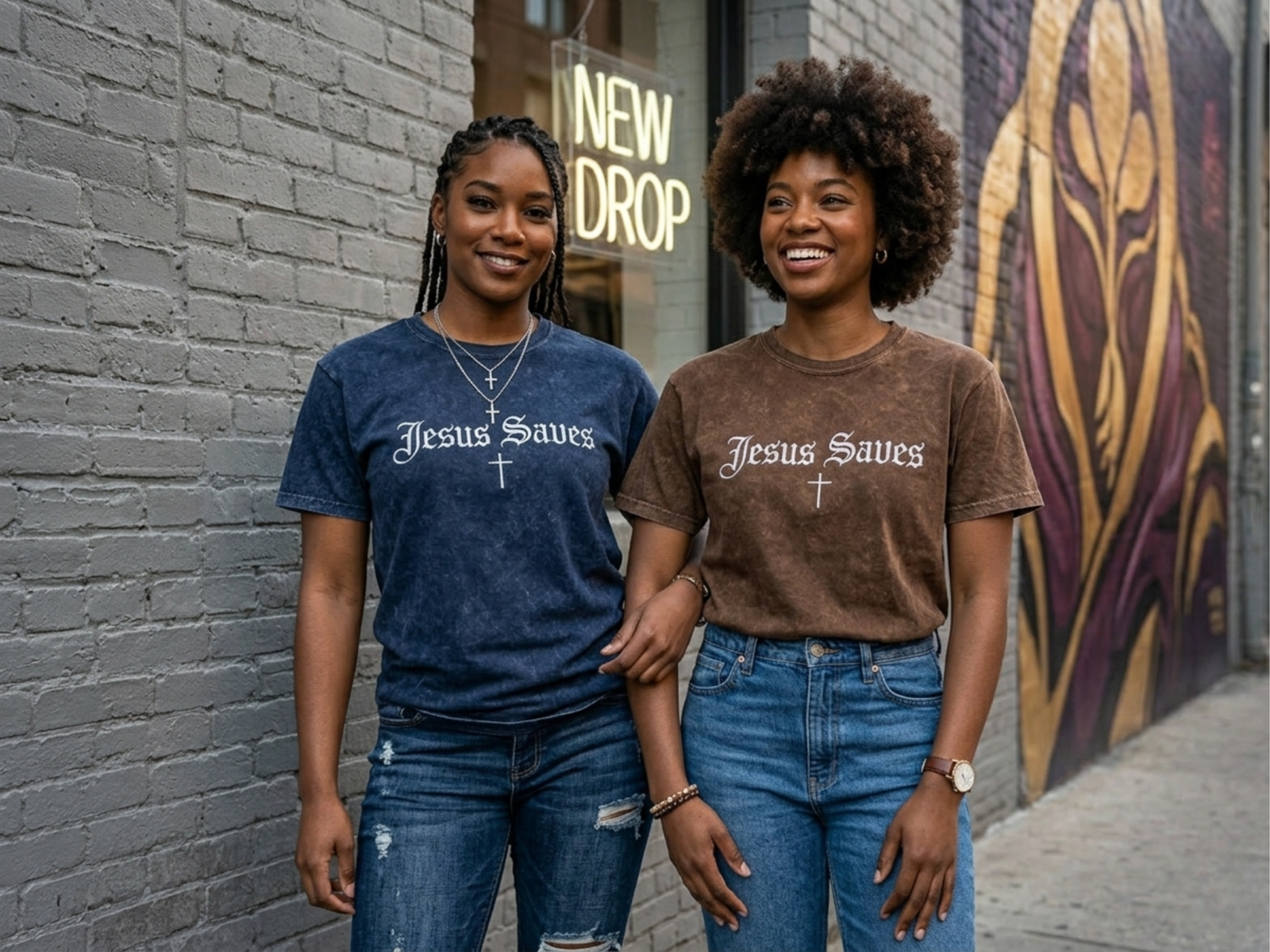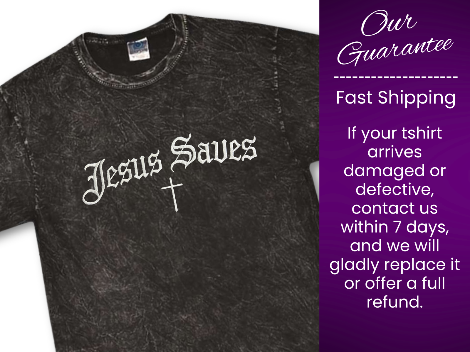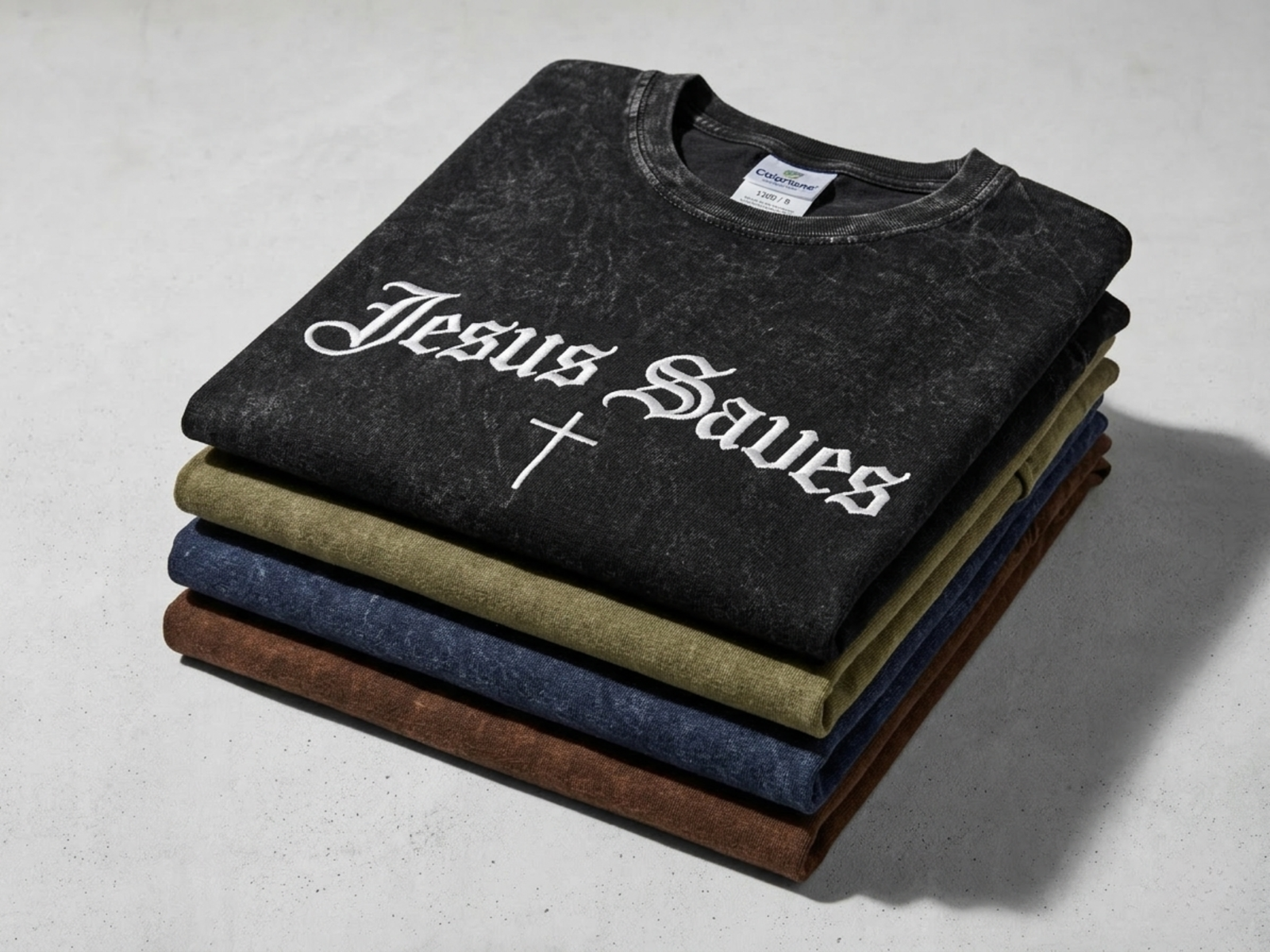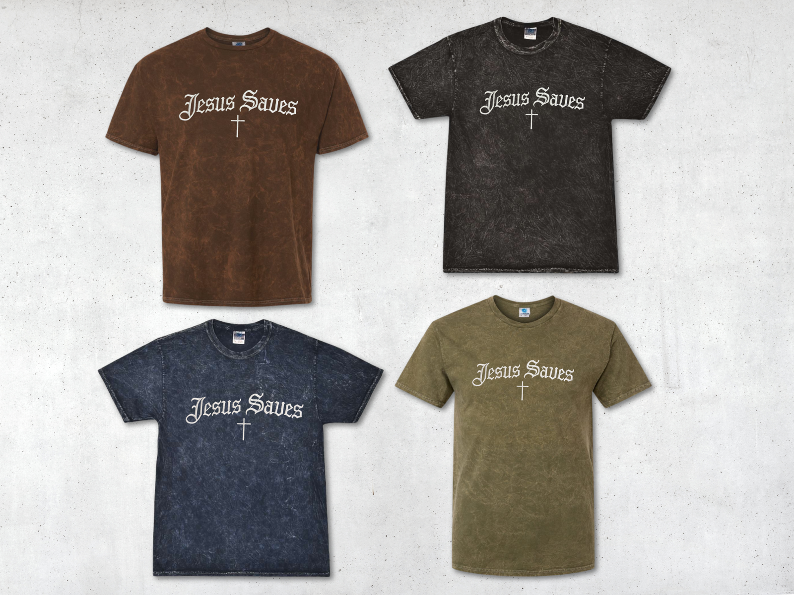Vintage-Soft Faith. Bold Statement. Elevate your wardrobe with the custom-embroidered “Jesus Saves” mineral wash tee. Crafted on the premium Colortone 1300 t-shirt, this tee combines unique texture with an impactful message. Available in four essential, washed colors, it’s a comfortable, durable way to share your faith.