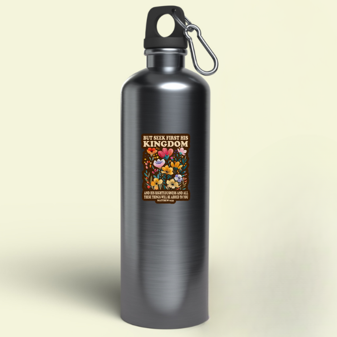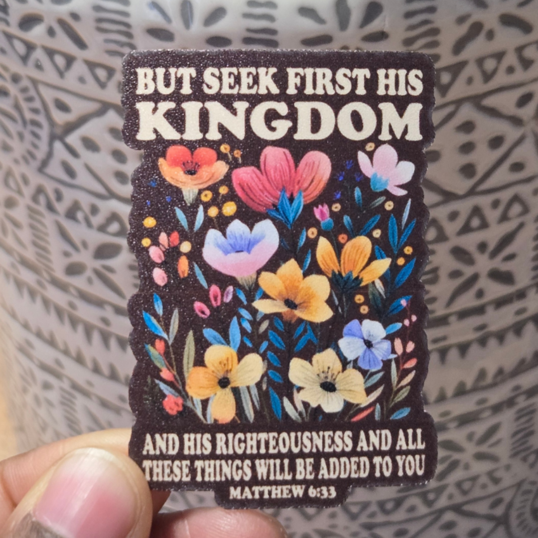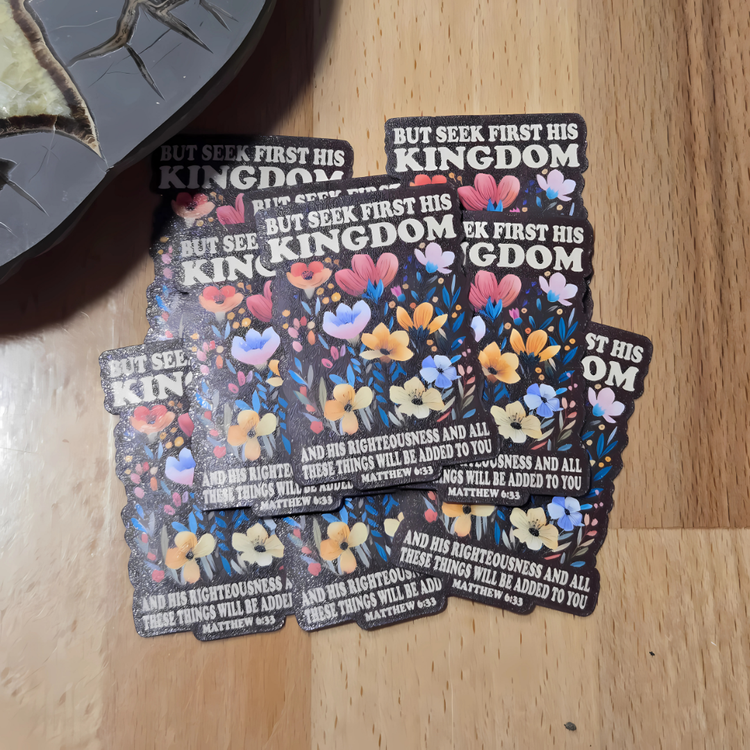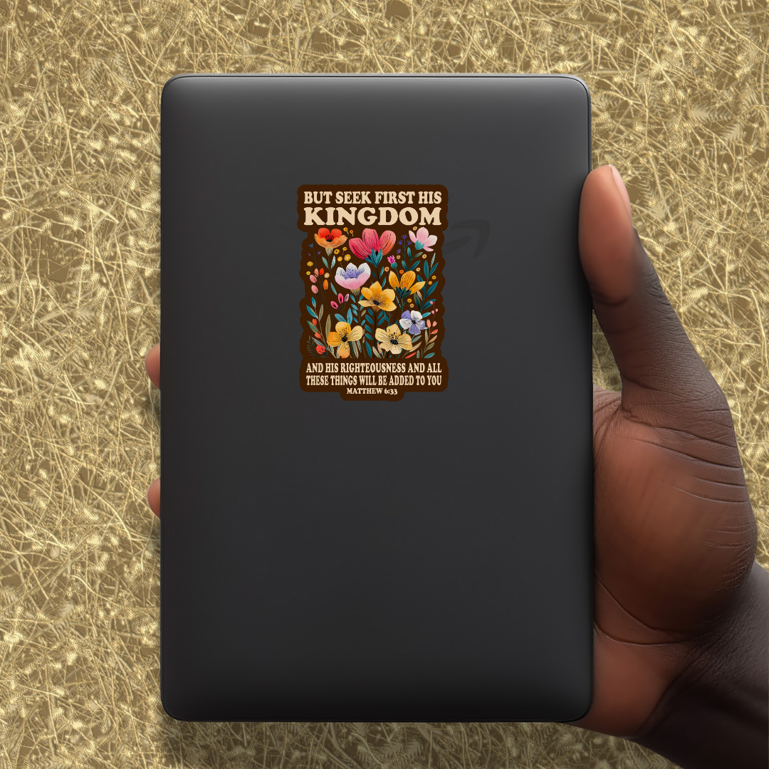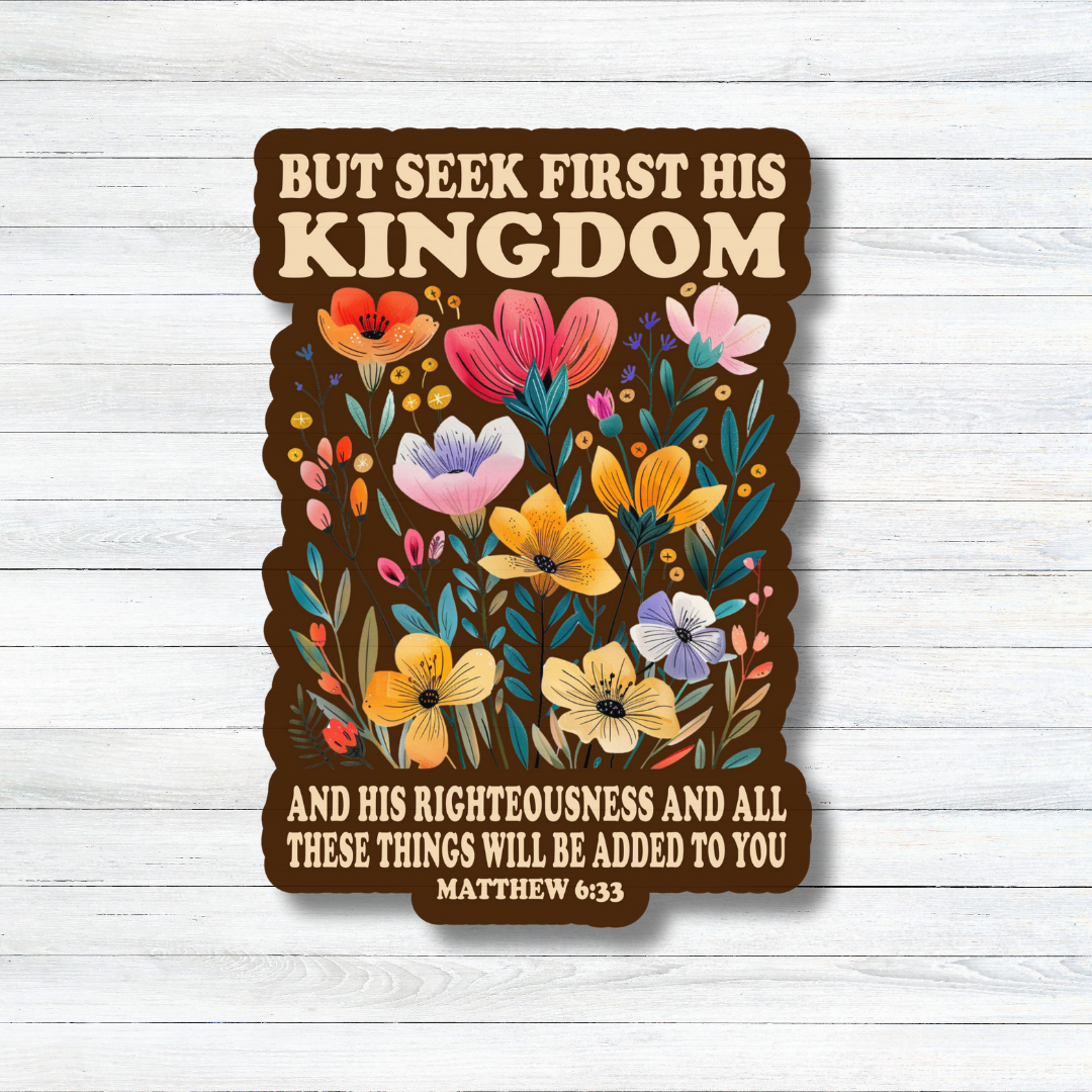 Keep your faith at the center of your life with this beautifully designed “Seek First His Kingdom” matte vinyl sticker featuring Matthew 6:33. This water-resistant, UV-protected sticker showcases vibrant floral artwork with an inspiring message, making it perfect for laptops, water bottles, journals, and more!